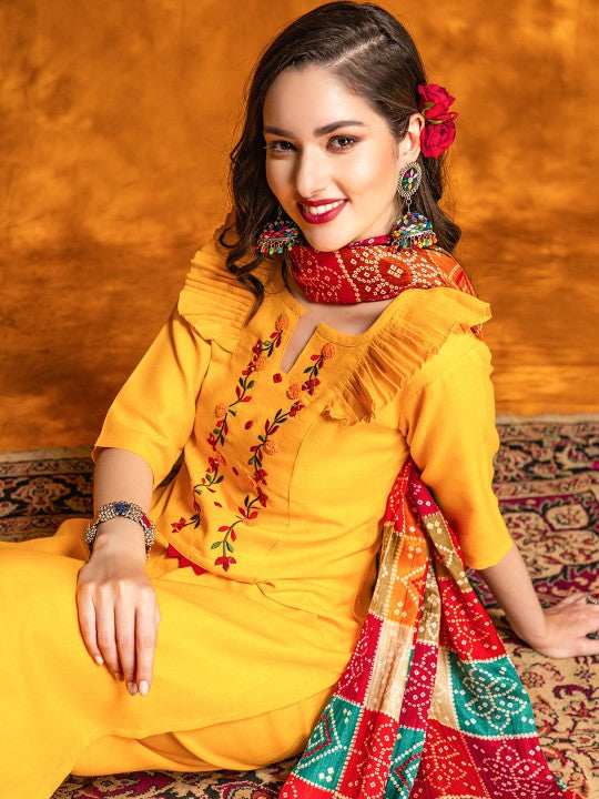 Floral Embroidered Mirror Work Pure Cotton Kurta With Patiala & With