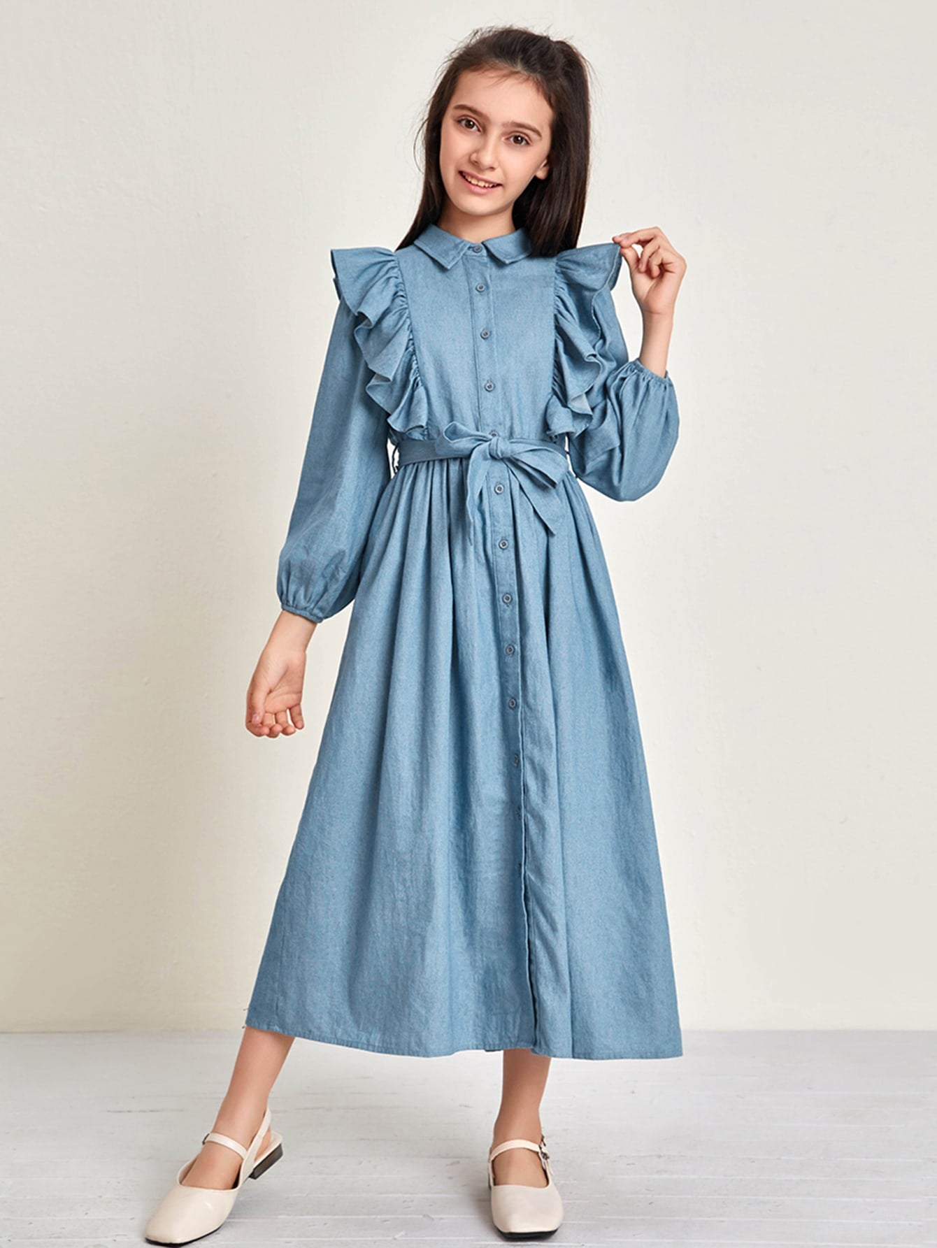 Girls Collared Buttoned Front Self Belted Ruffle Trim Dress