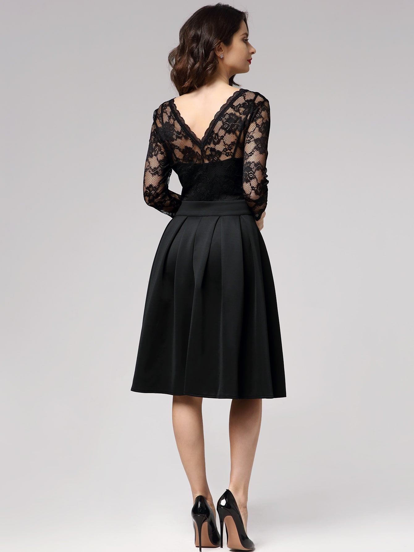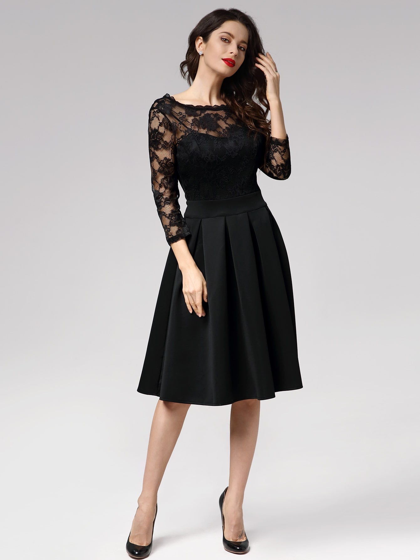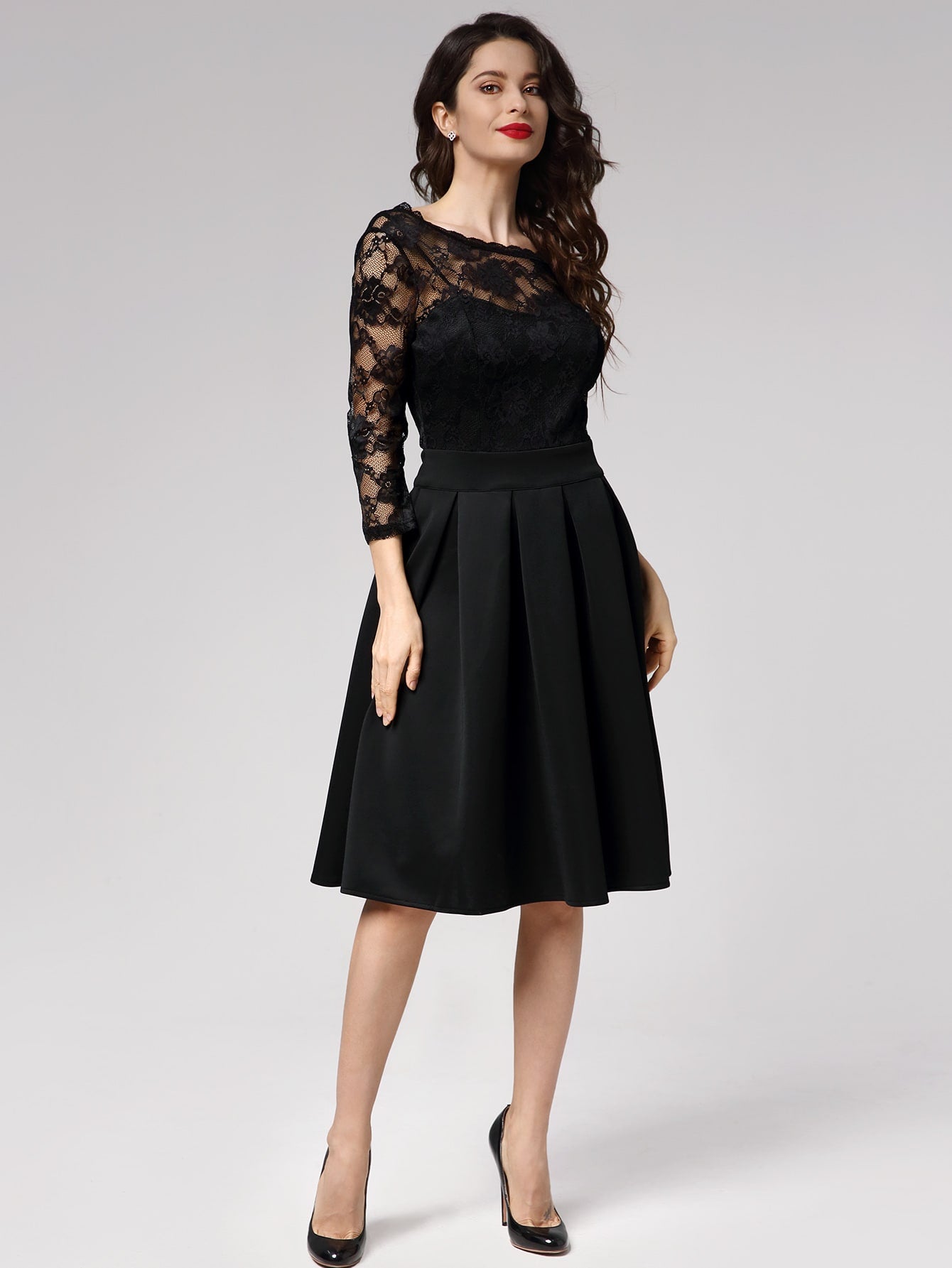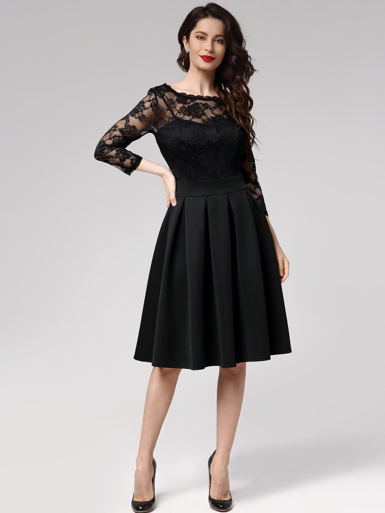 Sheer Yoke Lace Bodice Boxy Pleated Dress