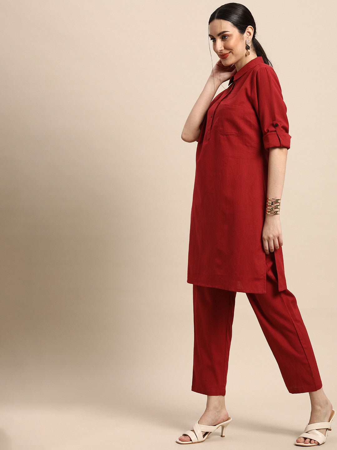 Women Maroon Solid Straight Kurta with Trousers